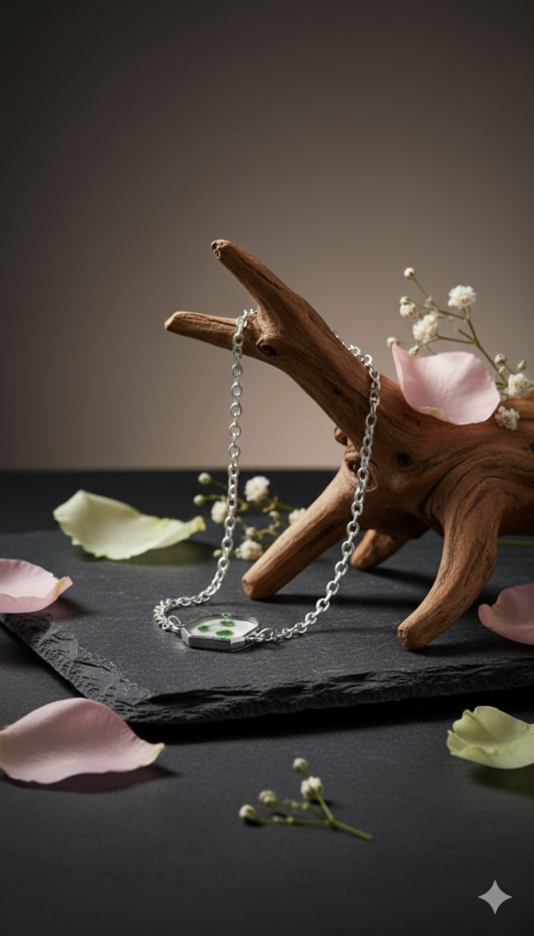Each pendant is individually made, ensuring no two pieces are exactly alike. The organic inclusions are carefully arranged to highlight their natural form, while the smooth, polished resin creates a luminous, glass-like finish that reflects light beautifully. The result is a wearable keepsake that feels both modern and deeply connected to nature.